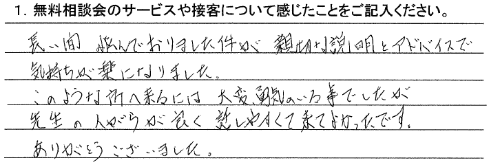 長い間悩んでおりました件が親身な説明とアドバイスで気持ちが楽になりました。